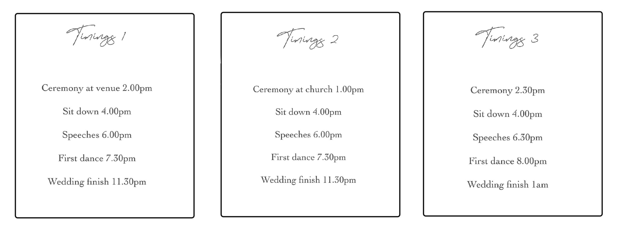 - Check how long your speeches are before the wedding and add 30% for a realistic time. Tell your speakers to keep it short, honestly no one likes long speeches. I once photographed a wedding with 3 hours of speeches – its safe to say that a lot of the guests were drifting haha.